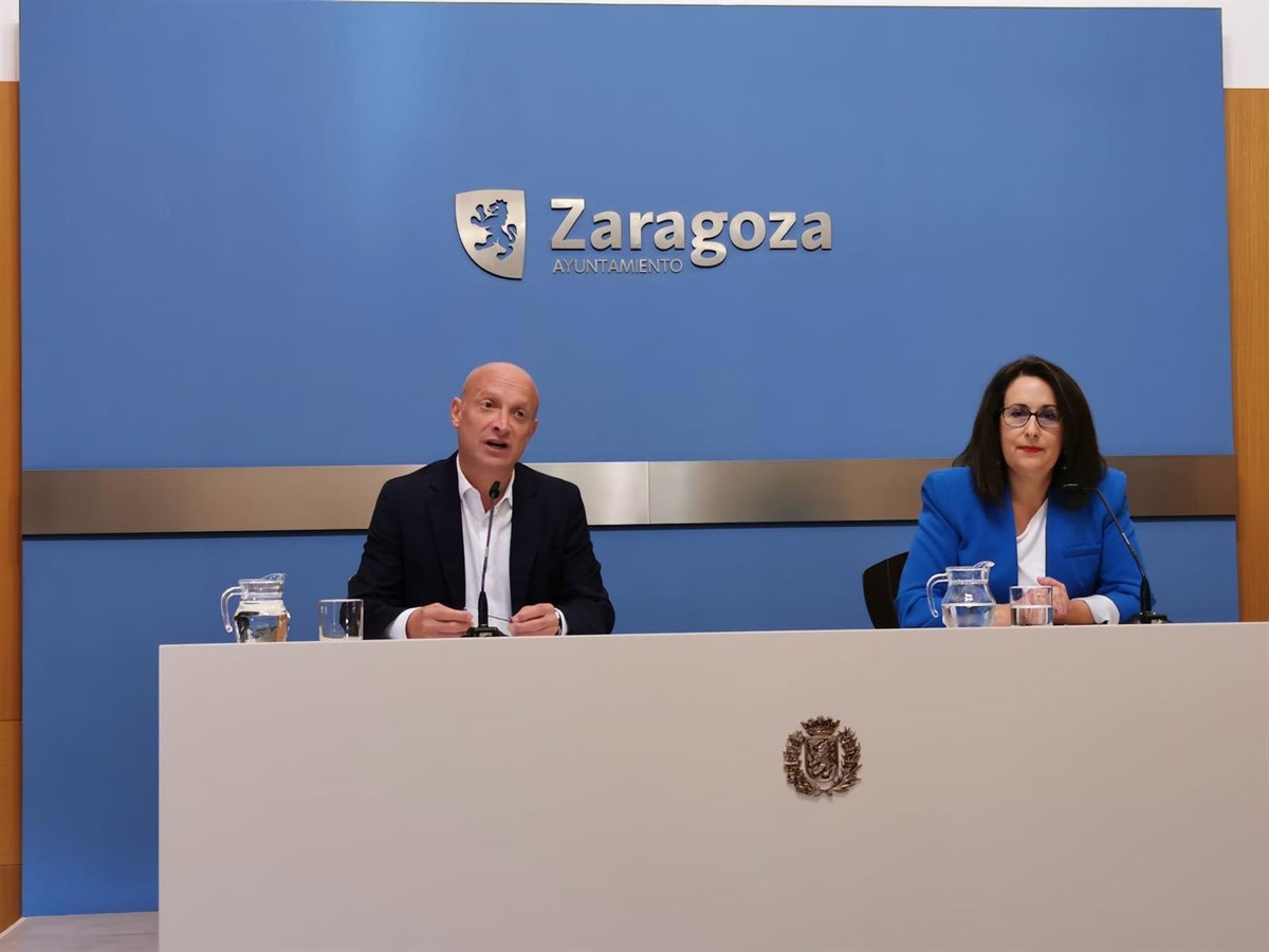 La concejal del grupo municipal de VOX en el Ayuntamiento de Zaragoza, Eva Torres; y el consejero municipal de Economía, Carlos Gimeno - DANI MARCOS