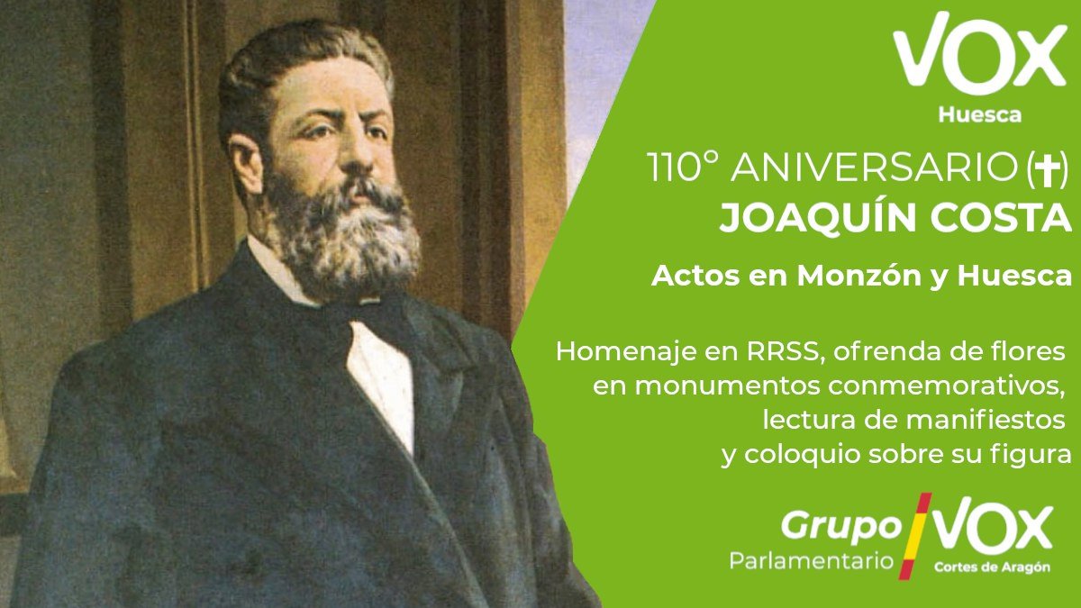 Para honrar su memoria y sus aportaciones, VOX Huesca ha organizado el próximo jueves, 4 de febrero, en Monzón, a las 11.00 horas, la lectura de un manifiesto y una ofrenda de flores junto al monumento a Joaquín Costa, ubicado en la avenida Lérida de la localidad montisonense.