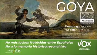 En esta mesa informativa se distribuirá el folleto con el que el grupo parlamentario VOX en Aragón quiere simbolizar el recuerdo y homenaje a Goya. Con la imagen de un famoso cuadro del pintor, la formación reivindicará su propuesta de "no más luchas fratricidas entre españoles", a la vez que se manifestará en contra "de una memoria histórica revanchista".