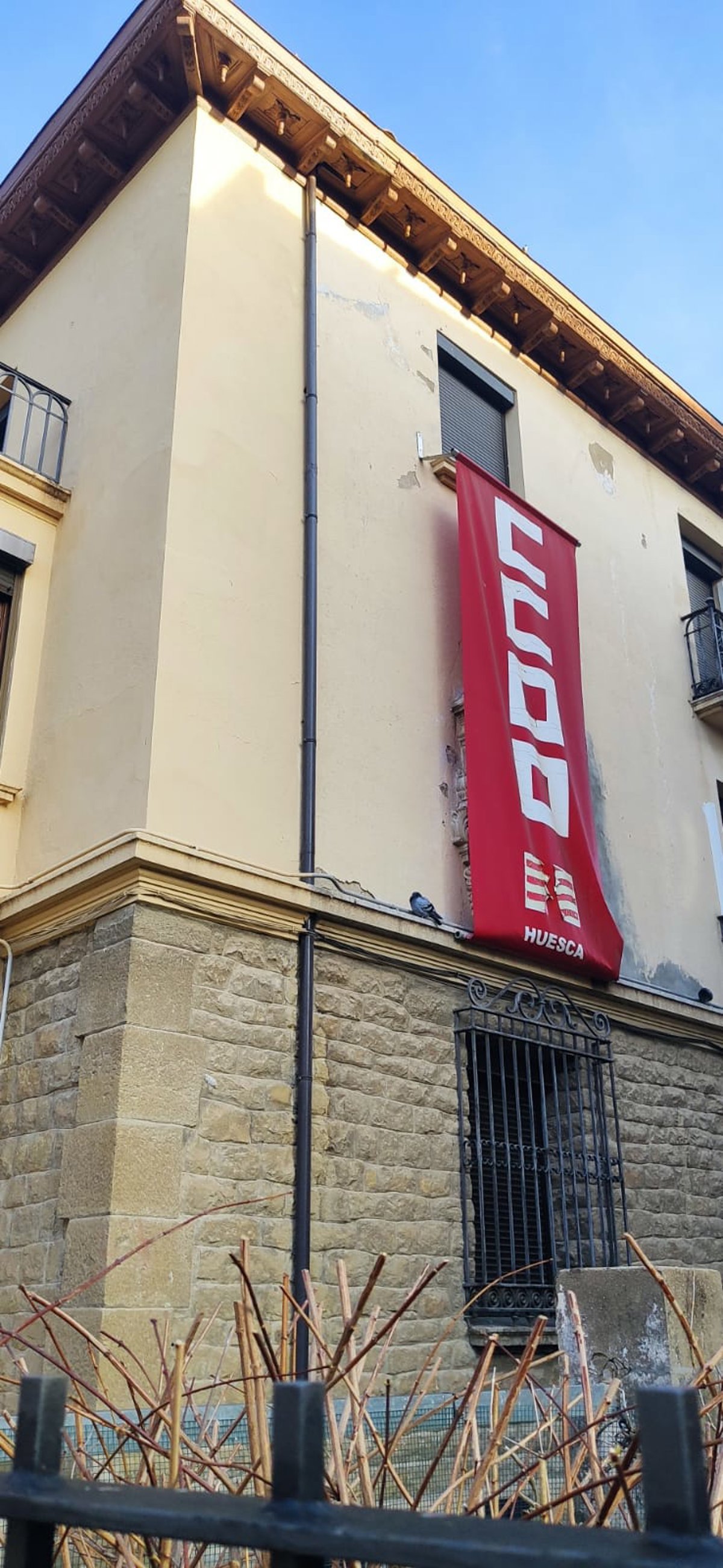 El grupo municipal de VOX en el Ayuntamiento de Huesca ha presentado un escrito en el registro del Ayuntamiento para aclarar la situación legal de una pancarta colocada en la fachada del edificio de la calle del Parque número 20 de la capital oscense, donde se encuentra la sede del sindicato Comisiones Obreras, tapando una imagen de la Virgen del Pilar.