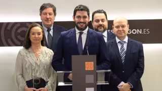 El portavoz de VOX, respaldado por el resto de integrantes de su grupo parlamentario, en la rueda de presenta de este viernes para anunciar un recurso contra el acuerdo plenario del Ayuntamiento de Bezas para derribar la cruz de la Peña de la Cruz. - VOX