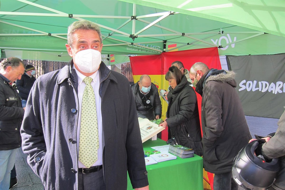 El presidente provincial de VOX Zaragoza, Julio Calvo, junto a las mesas informativas instaladas en la plaza de España de Zaragoza. - EUROPA PRESS