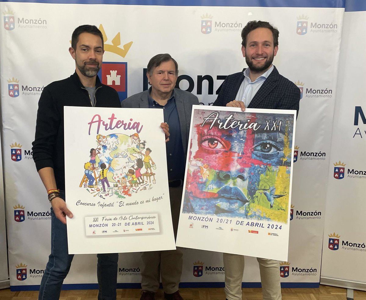 El alcalde de Monzón, Isaac Claver, el concejal de Ferias, Jairo Sánchez, y el director de la muestra, Gorgonio Sanjuan, han presentado este miércoles, en el Salón Azul de la sede consistorial, la XXI Edición de Arteria, que se celebra los días 20 y 21 de abril en el recinto de la Azucarera, y que conlleva como principal novedad se desarrollará el primer Simposio Internacional 'Ciudad de Monzón' con 35 artistas.