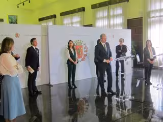 El alcalde ha comparecido en rueda de prensa, junto a la vicealcaldesa, Sara Fernández, y el resto de miembros del Gobierno municipal, junto a los portavoces de los grupos municipales, que han mantenido una distancia de más de un metro entre ellos.