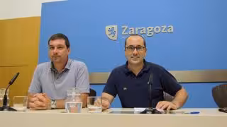 El consejero de Servicios Públicos y Personal del Ayuntamiento de Zaragoza, Alberto Cubero, y el concejal responsable de Remunicipalización y Municipalización del Ayuntamiento de Huesca, Luis Arduña, se han reunido este viernes en la capital aragonesa para colaborar y avanzar en la remunicipalización de los servicios públicos de ambos consistorios.