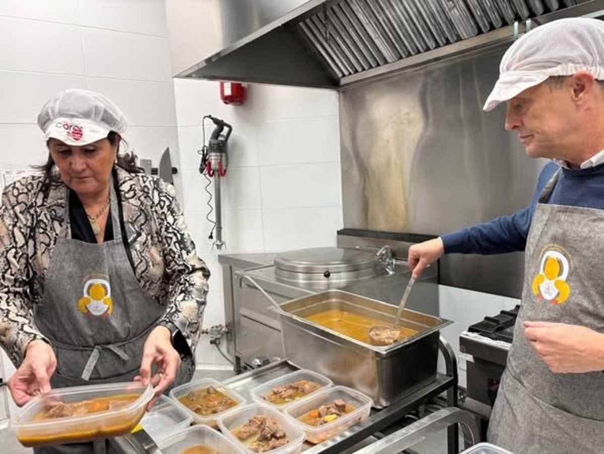 El primer plato, un arroz con verduras, ha sido donado por Mercadona, mientras que el segundo plato, un estofado, se elabora con productos cedidos por la Asociación de Comerciantes del Mercado Central.