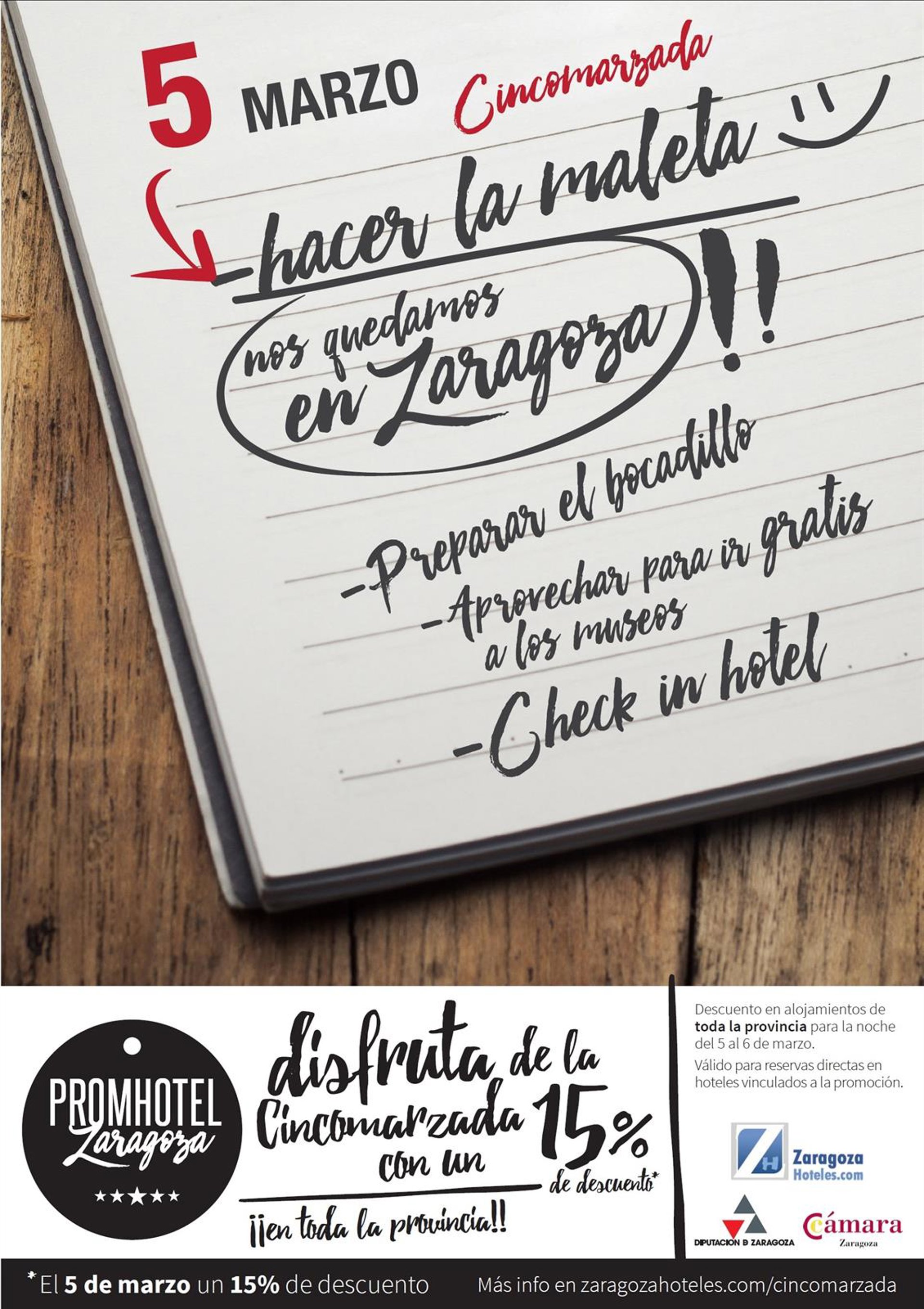 La Asociación de Hoteles de Zaragoza, la Cámara de Comercio, Industria y Servicios y la Diputación Provincial de Zaragoza retoman una promoción turística pionera, que ya se ofertó durante el puente de San Valero, y de la que todos los zaragozanos podrán volver a beneficiarse el día de la Cincomarzada. El sábado de la semana que viene, todas las personas nacidas o residentes en la provincia de Zaragoza tendrán un descuento del 15 por ciento en 26 establecimientos hoteleros: 17 de la capital y otros nueve del resto de la provincia.