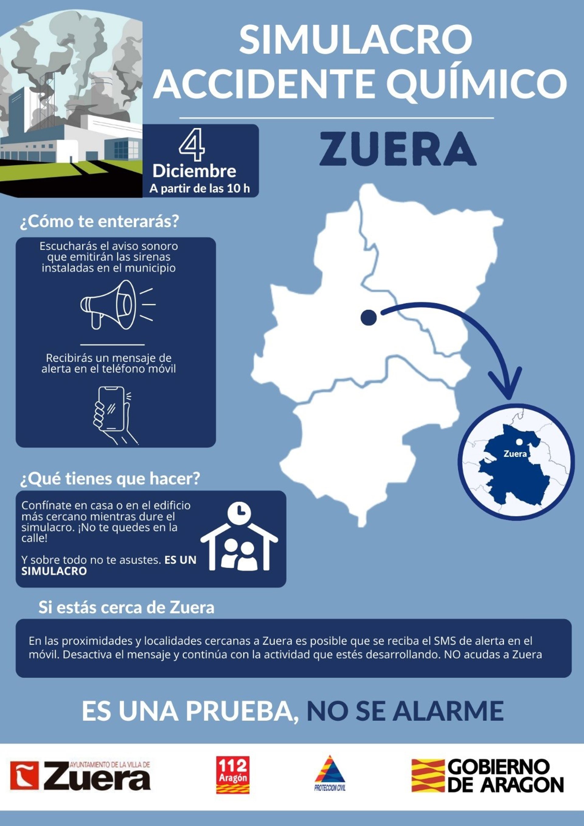 El Ayuntamiento de Zuera, 112 Aragón, Protección Civil y el Gobierno de Aragón piden a los zufarienses que no se asusten, ya que no se trata de una emergencia real, y que se confinen en casa o en el edificio más cercano mientras dure el simulacro; no en la calle.