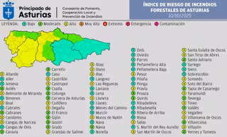 L'índiz de riesgu de quemes forestales n'Asturies asítiase esti xueves en nivel altu en 24 conceyos y moderáu n'otros 19, según les previsiones realizaes pol Institutu de Recursos Naturales y Ordenación del Territoriu (Indurot).