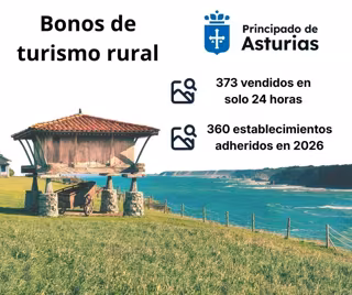 El Gobiernu Asturies punxo en marcha una nueva campaña de bonos de turismu rural. Nes 24 hores que lleven en marcha estos descuentos vendiéronse 372 bonos y la rede d'agospiamientos xuntaos creció casi un 73%, al pasar de los 208 rexistraos nel 2025 a los 360 d'anguaño.