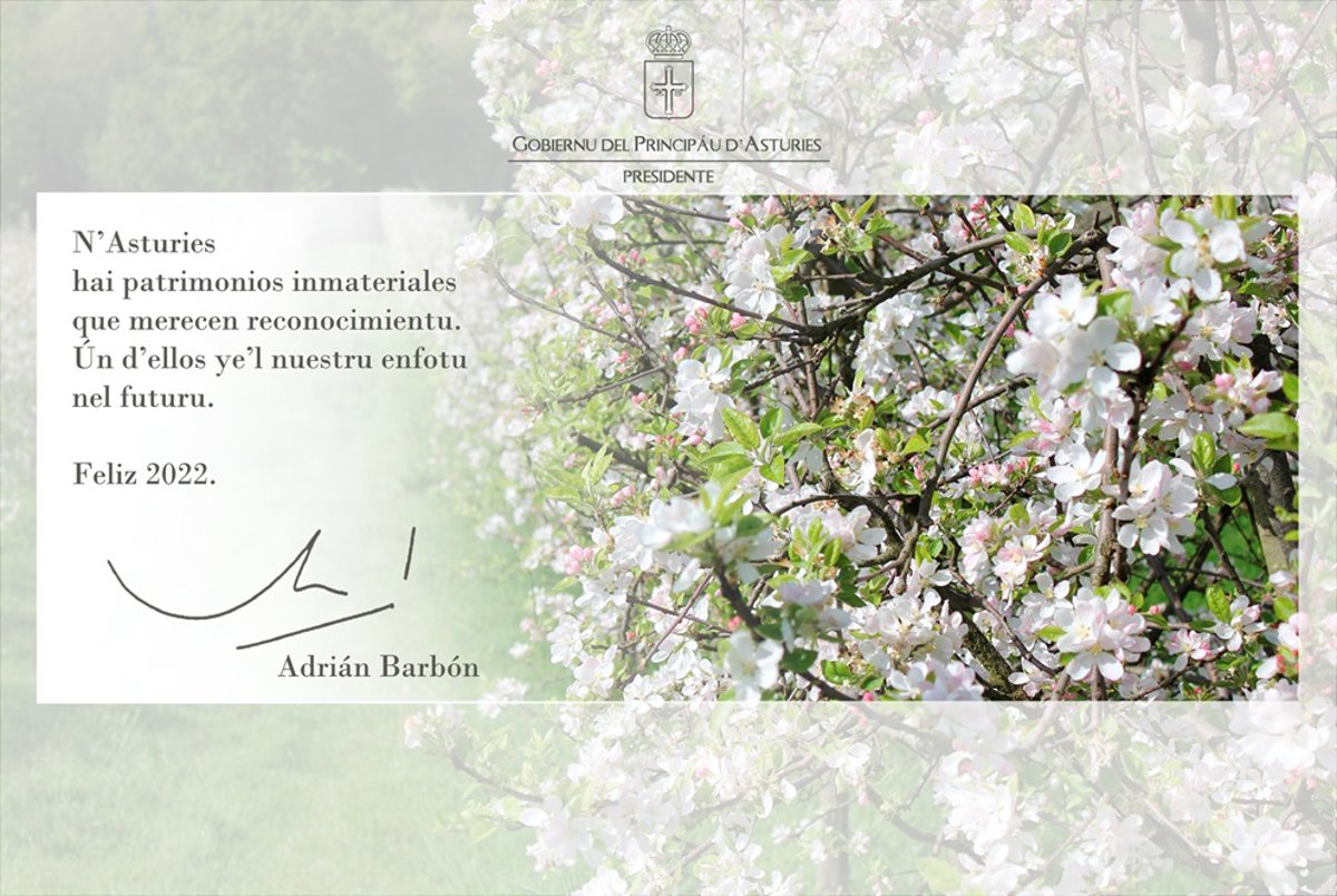 El presidente del Principáu d'Asturies, el socialista Adrián Barbón, felicitó les navidaes con una postal na que se pue lleer que "n'Asturies hai patrimonios inmateriales que merecen reconocimientu, ún d'ellos ye'l nuestru enfotu nel futuru".