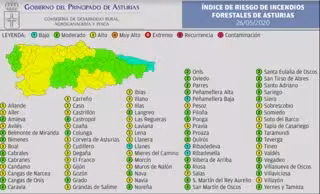 Un total de 35 de los 78 municipios del Principado de Asturias tendrán este martes riesgo 'alto' de sufrir incendios forestales, según la Información de la Dirección General de Planificación, Infraestructuras Agrarias y Montes calculada en base a las previsiones meteorológicas de AEMET.