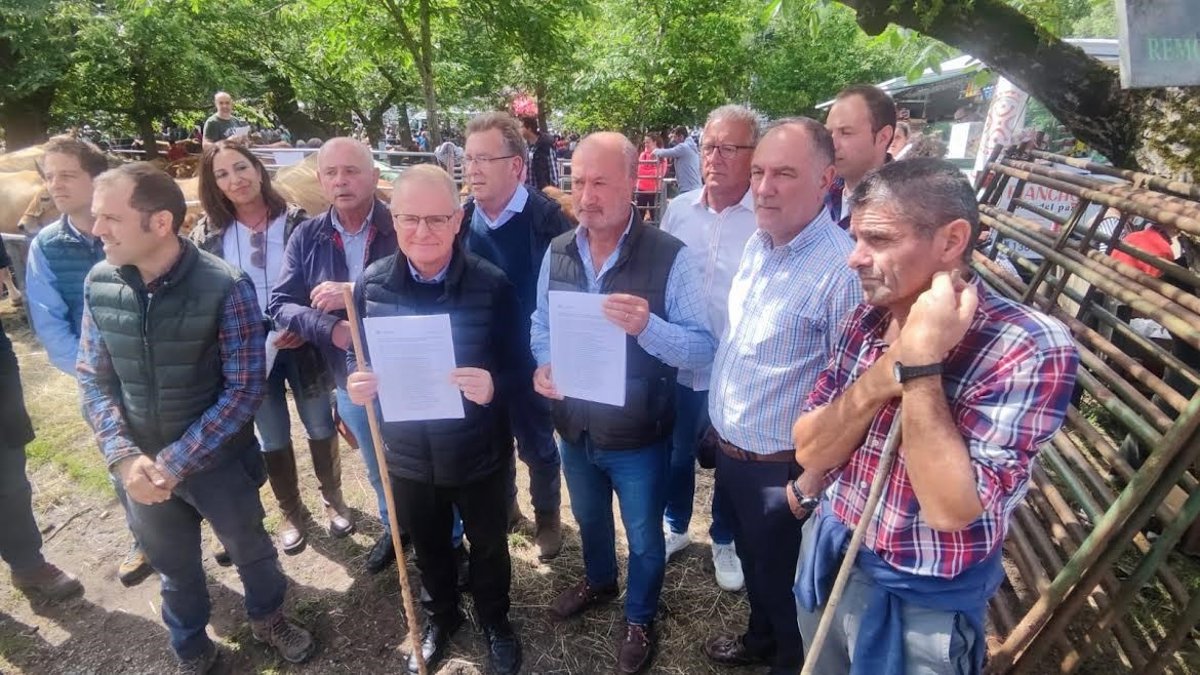Diego Canga visitó la Feria ganadera de Corao, junto, entre otros, a Luis Venta y el candidato a la reelección a la alcaldía de Cangas de Onís, José Manuel González Castro. Según el PP, el manifiesto persigue "salvar el futuro del sector".