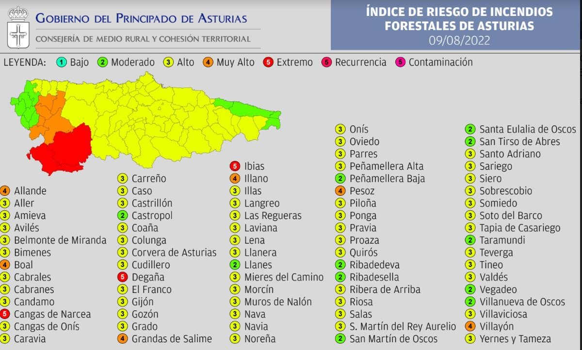 Además, los concejos de Allande, Boal, Grandas de Salime, Illano, Pesoz y Villayón presentarán riesgo 'muy alto'. En la mayoría del resto de la región, el riesgo será 'alto'.