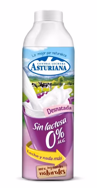La familia de productos sin lactosa de Central Lechera Asturiana, compuesta por leche en formato botella de 1.5 litros y de 1 litro, leche 0% MG en formato de litro, nata y queso, "tiene todo lo bueno de la leche", 0 por ciento de lactosa y un refuerzo de calcio.