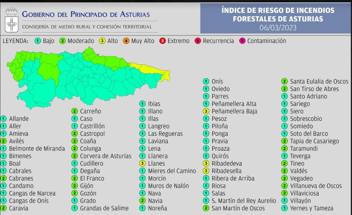 Según las mismas previsiones en otros 22 municipios asturianos el riesgo será 'moderado'. Se trata de los concejos de Avilés, Cabranes, Caravia, Carreño, Castropol, Coaña, Colunga, Corvera de Asturias, El Franco, Gijón, Gozón, Navia, San martín de Oscos, Santa Eulalia de Oscos, San Tiro de Abres, Tapia de Casariego, Taramundi, Tineo, Valdés, Vegadeo, Villanueva de Oscos y Villaviciosa.
