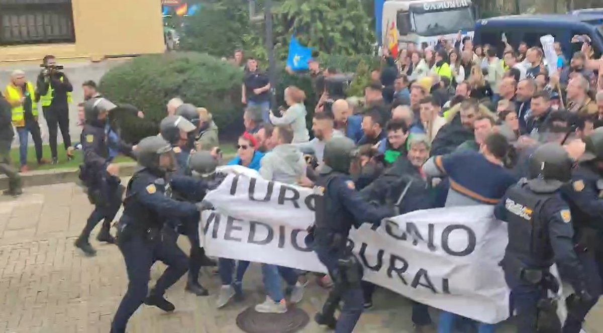 Los agentes de la Policía Nacional desplegados han hecho uso de sus porras para evitar que los manifestantes avanzasen, algo que querían hacer a pesar de que les negaban el paso. Algunos de los manifestantes portaban varas. Uno de los tractores desplegados en la protesta se ha aproximado también al lugar.