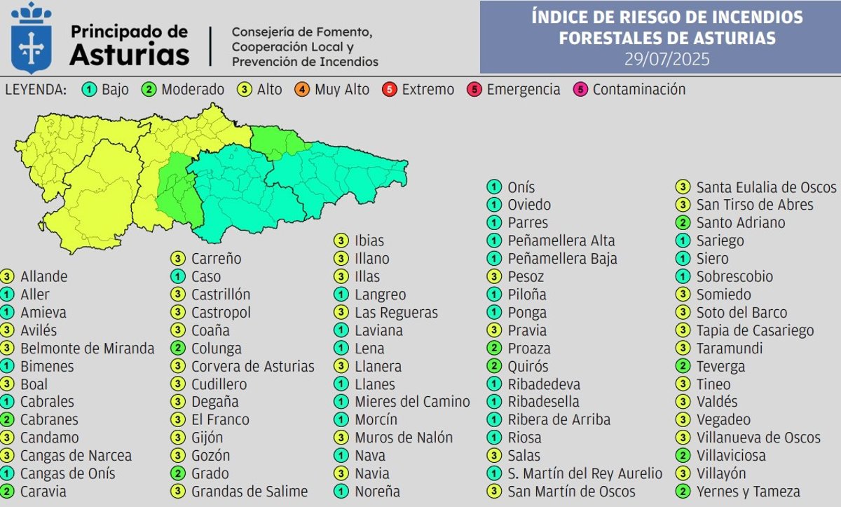 El mayor riesgo de incendio se dará en los concejos del occidente y litoral central, mientras que en el oriente el riesgo será 'bajo'. En concreto, los municipios con riesgo 'alto' son Allande, Avilés, Belmonte de Miranda, boal, Candamo, Cangas del Narcea, Carreño, Castrillón, Castropol, Coaña, Corvera, Cudillero, Degaña, El Franco, Gijón, Gozón, Grandas de Salime, Ibias, Illano, Illas, Las Regueras, Llanera, Muros de Nalón, Navia, Pesoz, Pravia, Salas, San Martín de Oscos, Santa Eulalia de Oscos, San Tirso de Abres, Somiedo, Soto del Barco, Tapia de Casariego, Taramundi, Tineo, Valdés, Vegadeo, Villanueva de Oscos y Villayón.