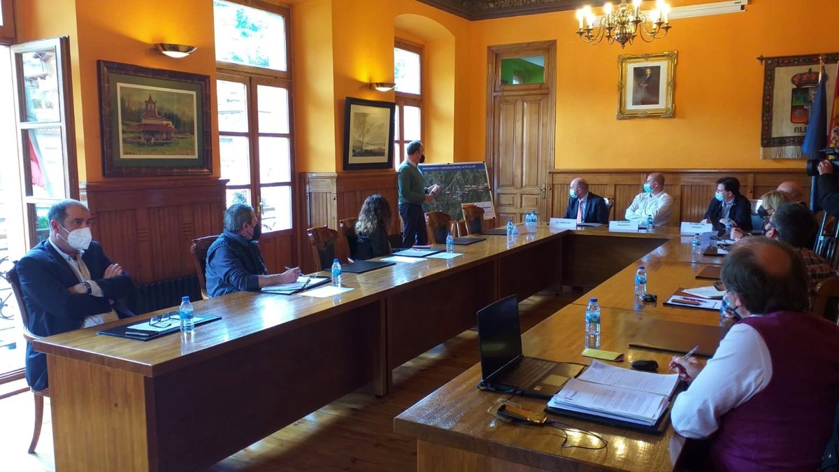 Cofiño, acompañado por el director general de Calidad Ambiental y Cambio Climático, Pablo Álvarez Cabrero, ha explicado este lunes la actuación que acometerá su departamento al alcalde de Aller, Juan Carlos Iglesias, y a los portavoces de los grupos municipales, en la sede del Ayuntamiento, en Cabañaquinta.