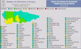 Un total de nueve concejos del Principado presentarán este martes riesgo 'alto' de sufrir incendio forestal según la información de la Dirección General de Planificación, Infraestructuras Agrarias y Montes calculada en base a las previsiones meteorológicas de AEMET.