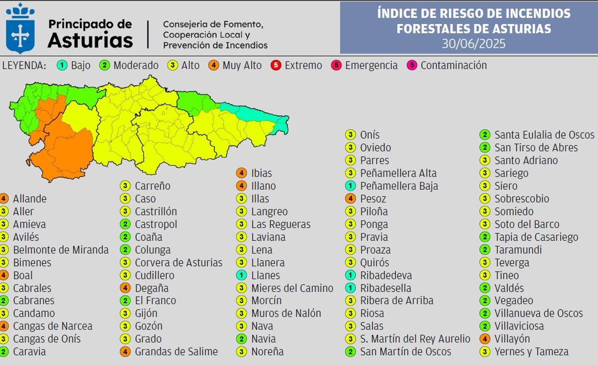 Un total de nueve concejos del occidente asturiano están hoy en riesgo muy alto de incendios forestales, según las previsiones del Instituto de Recursos Naturales y Ordenación del Territorio (Indurot). El organismo trabaja con una escala de cinco niveles constituida, de menor a mayor, por las categorías 'bajo', 'moderado', 'alto', 'muy alto' y 'extremo'.
