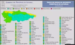 Un total de nueve municipios del Principado de Asturias presentarán este martes riesgo 'alto' de sufrir incendio forestal, según las previsiones de la Dirección General de Planificación, Infraestructuras Agrarias y Montes calculada en base a las previsiones meteorológicas de AEMET disponibles a las 9:30 horas del día de hoy y de los datos de recurrencia temporal y espacial de incendios forestales.
