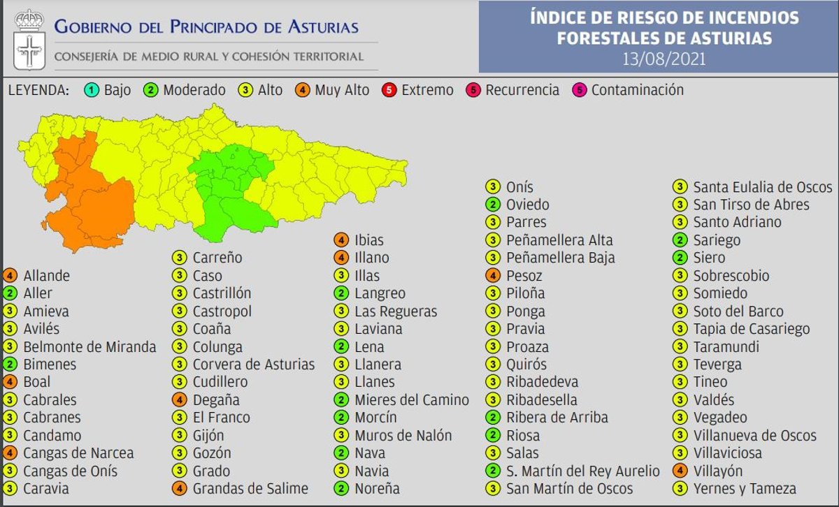 En otros catorce municipios el riesgo será 'Moderado'. Concretamente en Aller, Bimenes, Langreo, Mieres, Morcín, Lena, Nava, Noreña, Oviedo, Ribera de Arriba, Riosa, San martín del Rey Aurelio, Sariego y Siero.