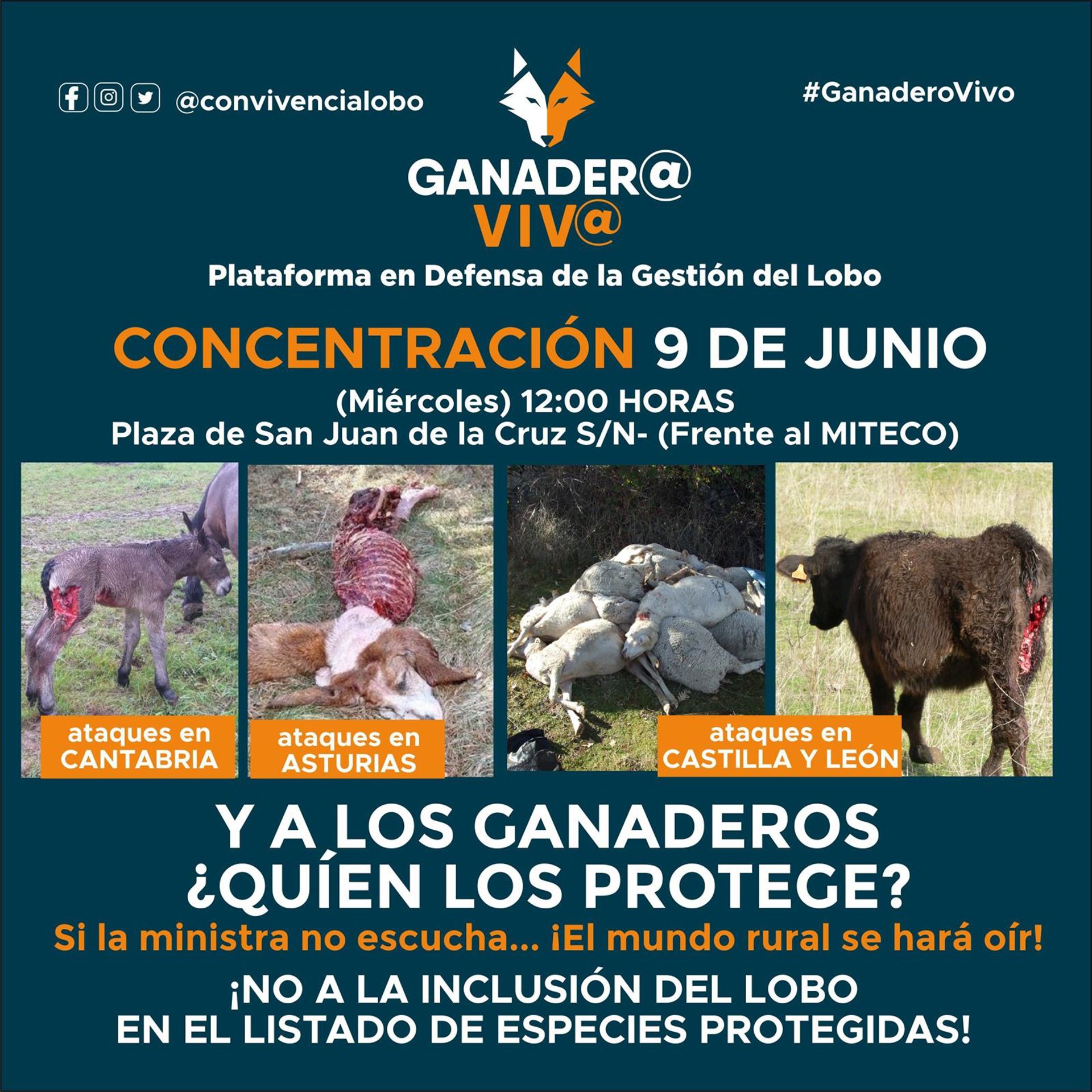 La Plataforma en Defensa de la Gestión del Lobo 'Ganader@ Viv@' ha animado al mundo rural a acudir a la concentración convocada para este miércoles, 9 de junio, a las 12,00 horas, frente al Ministerio de Transición Ecológica y del Reto Demográfico (Miteco) en Madrid, para mostrar su rechazo a la inclusión del lobo en el Listado de Especies Silvestres en Régimen de Protección Especial (Lespe).