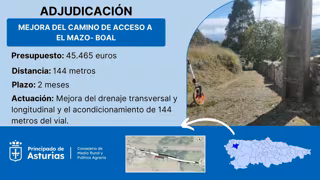 La Consejería de Medio Rural y Política Agraria ha adjudicado por 45.465 euros las obras de reparación del camino de acceso a El Mazo, en Boal. La empresa encargada de ejecutar estos trabajos será Transportes y Maquinaria Gonzalo S.L y el plazo para llevarlos a cabo será de dos meses.