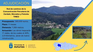 La Consejería de Medio Rural y Política Agraria del Gobierno asturiano invertirá 379.997 euros en la construcción de la red de caminos de la concentración parcelaria de Zardaín, Moraos y Freisnéu, en Tineo. La empresa adjudicataria, Trabajos Salense, dispone de once meses para completar los trabajos.