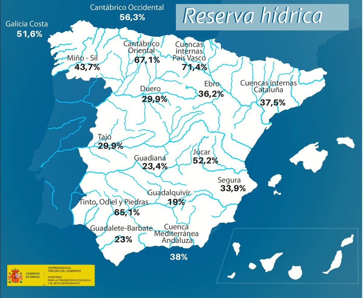 La reserva por ámbitos es la siguiente: Cantábrico Oriental se encuentra al 67,1%; Cantábrico Occidental al 56,3%; Miño-Sil al 43,7%; Galicia Costa al 51,6%; Cuencas internas del País Vasco al 71,4%; Duero al 29,9%; Tajo al 35,5%; Guadiana al 23,4%; Tinto, Odiel y Piedras al 65,1%; Guadalete-Barbate al 23%; Guadalquivir al 19%; Cuenca Mediterránea Andaluza al 38%; Segura al 33,9%; Júcar al 52,2%; Ebro al 36,2%; y Cuencas internas de Cataluña al 37,5%.