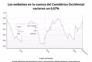 La reserva hidráulica del Cantábrico Occidental está al 89 por ciento de su capacidad esta semana. En el conjunto nacional, la reserva hidráulica se encuentra al 60,5 por ciento de su capacidad. Los embalses españoles almacenan actualmente 33.944 hectómetros cúbicos (hm3) de agua, disminuyendo en la última semana en 99 hectómetros cúbicos, según información publicada este martes por el Ministerio para la Transición Ecológica.