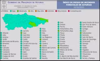 Un total de siete municipios del Principado presentarán este lunes riesgo 'moderado' de sufrir un incendio forestal, según Información de la Dirección General de Planificación, Infraestructuras Agrarias y Montes calculada en base a las previsiones meteorológicas de AEMET.