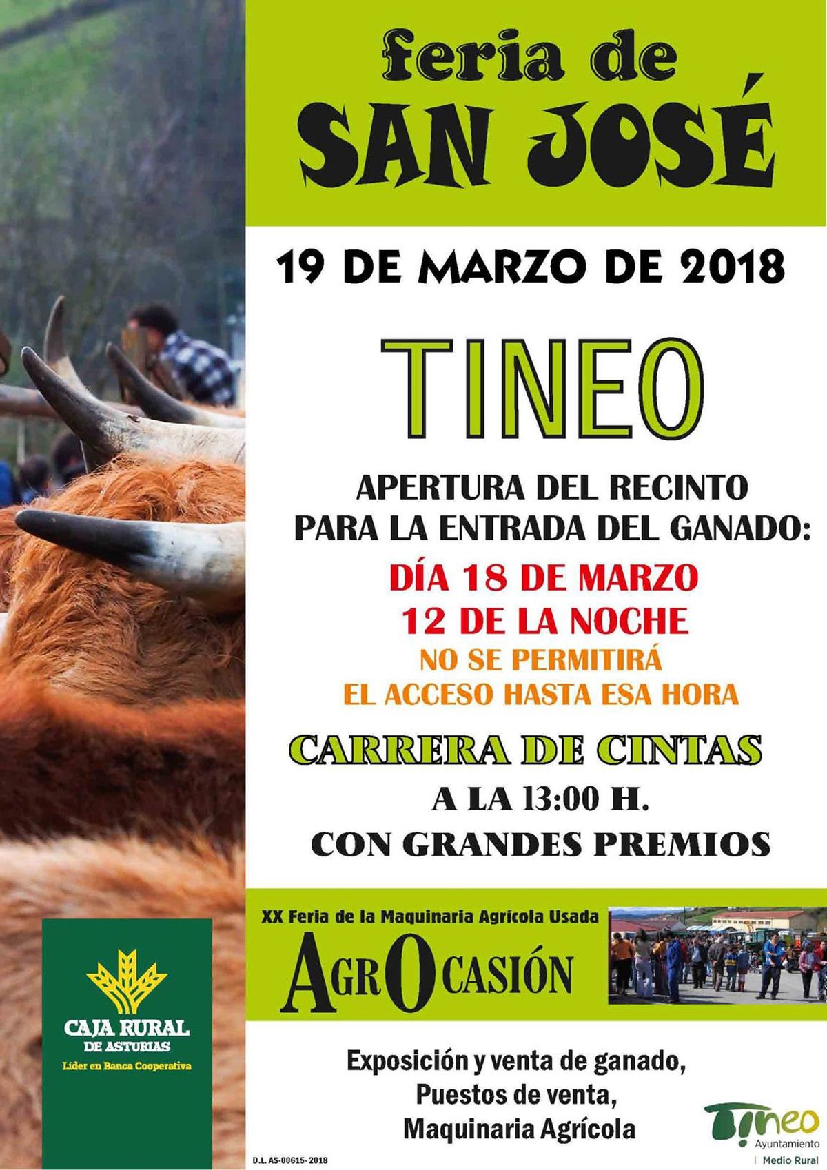 El próximo lunes 19 de marzo se celebra en Tineo la tradicional feria ganadera de San José, primera gran cita de la primavera para las ganaderías del occidente asturiano. Desde primeras horas de la mañana, el recinto ferial de Santa Teresa se irá llenando con reses de ganado vacuno y equino.