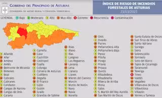 El riesgo de incendio será 'alto' en el resto de concejos, Allande, Avilés, Bimenes, Boal, Cabranes, Candamo, Caravia, Carreño, Castrillón, Colunga, Corvera, Cudillero, Gijón, Gozón, Grandas de Salime, Illano, Illas, Langreo, Las Regueras, Llanera, Llanes, Morcín, Muros del Nalón, Nava, Noreña, Oviedo, Peñamellera Baja, Pesoz, Pravia, Ribadedeva, Ribadesella, Ribera de Arriba, Riosa, Salas, San Martín del Rey Aurelio, Sariego, Siero, Soto del Barco, Villaviciosa y Villayón.