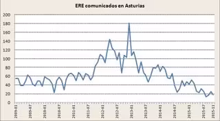 Durante el undécimo mes del año se han comunicado en Asturias 18 ERE, un 52,6 por ciento menos que los comunicados el mismo mes del año anterior. Sin embargo, el número de trabajadores afectados ha aumentado un 27 por ciento.