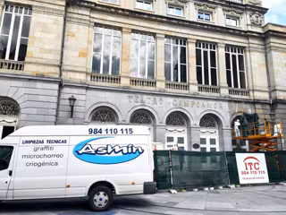 Tareas de limpieza de la fachada del Teatro Campoamor. - EUROPA PRESS.