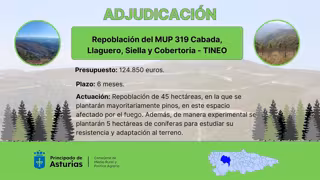 La Consejería de Medio Rural y Política Agraria ha adjudicado en 124.850 euros la repoblación de 45 hectáreas del monte de utilidad pública de Cabada, Llaguero, Siella y Cobertoria, en Tineo, afectado por un incendio. La empresa adjudicataria, Parrondo Obras y Servicios, cuenta con un plazo de seis meses para ejecutar los trabajos.