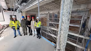 El aparejador municipal, Daniel Amores; el restaurador de la obra, Carlos Nodal; la concejala de Cultura, Aurora Cienfuegos; la edil de Educación Eva Iglesias; la arquitecta municipal, María José Fernández, y Emilio González de la empresa adjudicataria. - AYUNTAMIENTO DE SIERO
