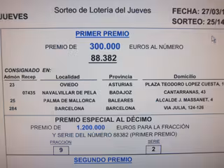 Este número del Premio Nacional de Lotería también se ha vendido en Navalvillar de la Pela (Badajoz); en Palma de Mallorca y en Barcelona.