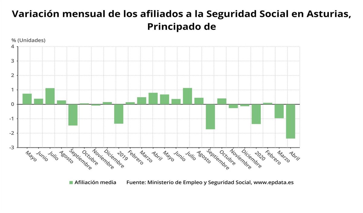 En comparación con los datos registrados en marzo, Asturias perdió 8.529 afiliados en el cuarto mes del año, mientras que si se compara con el mismo mes de 2019, el descenso es del 3,69% y 13.439 personas.