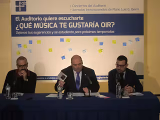 En la presentación, celebrada en el Auditorio Príncipe Felipe de la capital asturiana, Iglesias Caunedo estuvo acompañado por el propio Marzio Conti y por el coordinador del ciclo musical 'Conciertos del Auditorio' y las 'Jornadas de Piano Luis G. Iberni', Cosme Marina.
