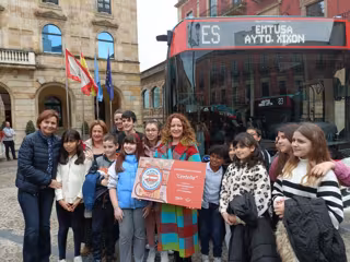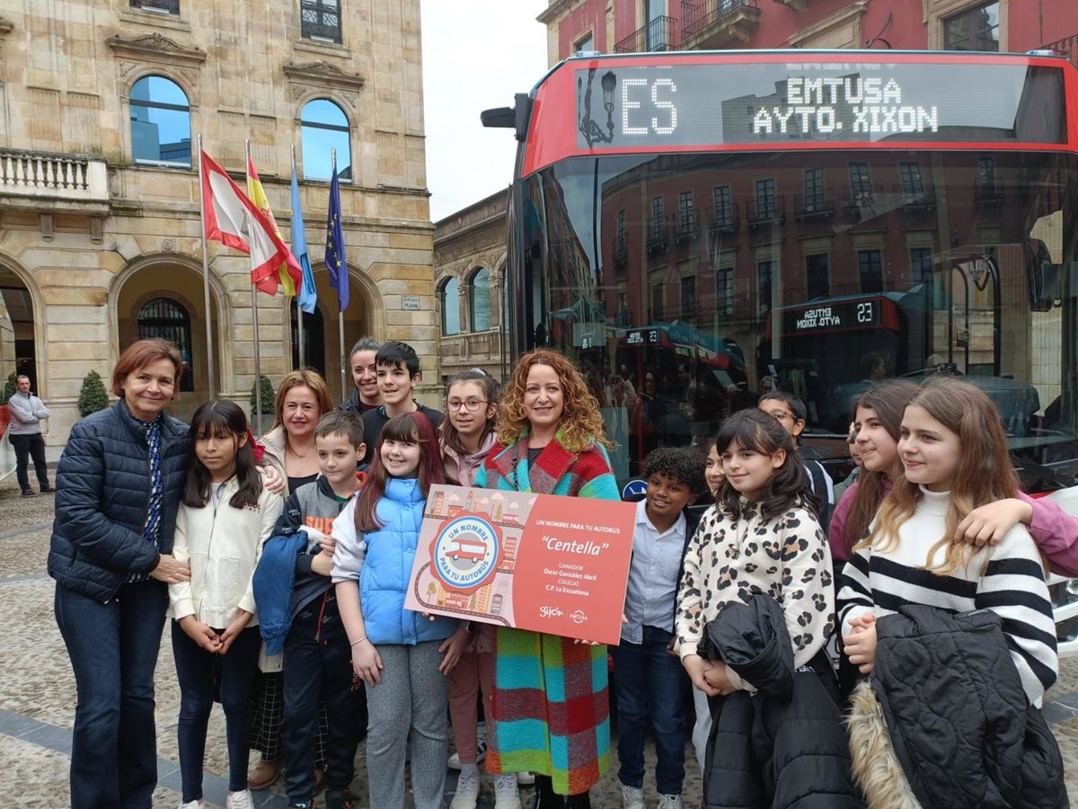 La alcaldesa de Gijón, Carmen Moriyón, junto a alumnos del colegio público 'Escuelona' que han puesto nombre a unos de los primeros seis autobueses eléctricos de línea regular de Emtusa. - EUROPA PRESS