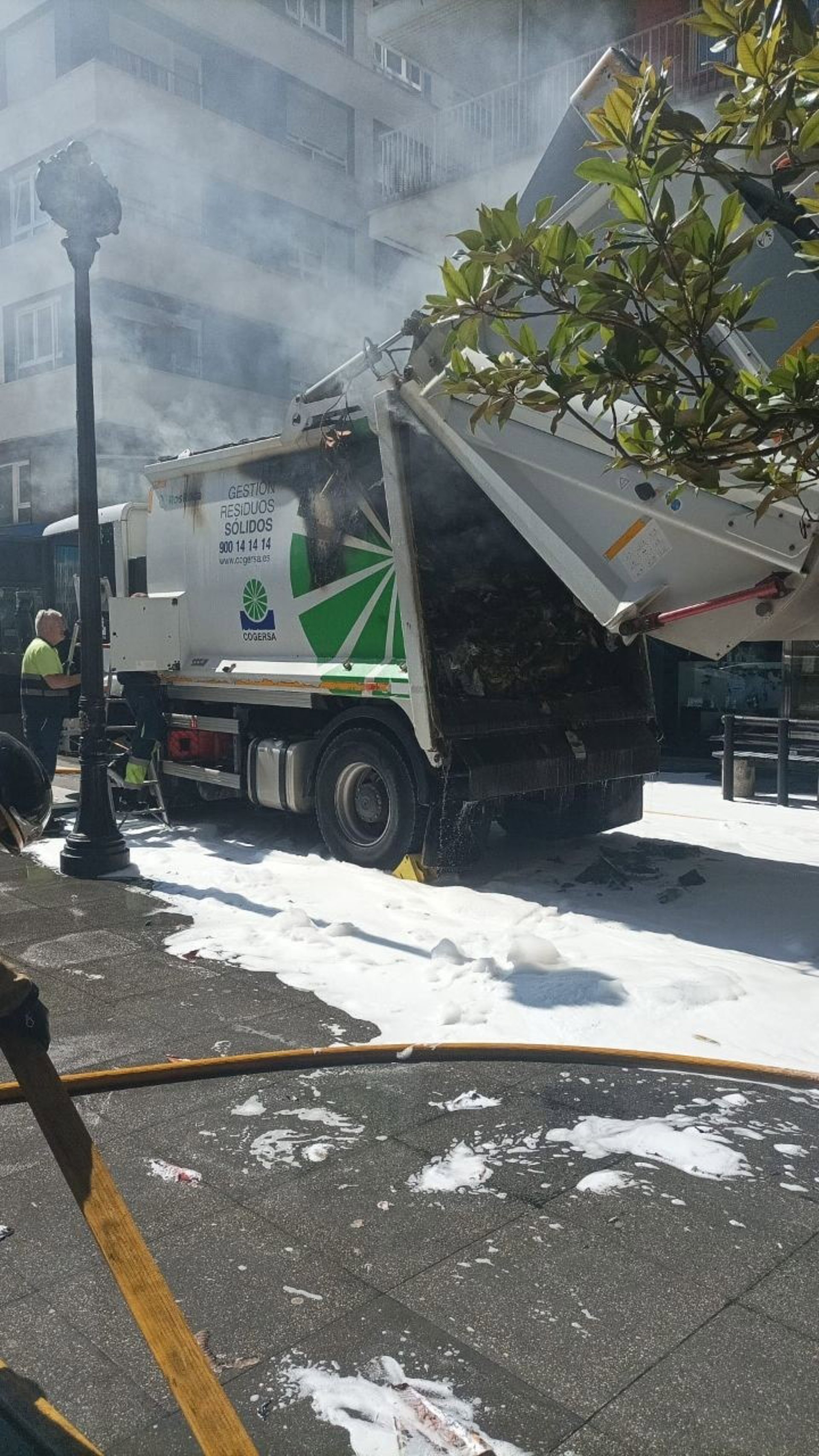 La carga de un camión de Cogersa de residuos sólidos se ha incendiando por causas que se desconocen en el cruce entre las calles Covadonga y Cabrales, en el centro de Gijón.