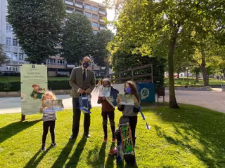 El teniente de alcalde y concejal de Participación del Ayuntamiento de Oviedo, Mario Arias, ha entregado este martes los diplomas infantiles a participantes en la decoración del mural del Skate Park 'Ignacio Echevarría.