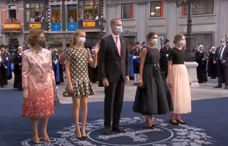 Los Reyes entraron con sus hijas, el Rey con traje negro y corbata rosa, y la Reina Letizia con un vestido negro de vuelo. La Familia Real posó ante el Campoamor entre pitidos de manifestantes contrarios a la celebración y, tras saludar a las autoridades, fueron recibidos con vítores por parte de los asistentes que esperaban dentro del teatro y que les dedicaron un largo aplauso al que sucedió el himno de España.