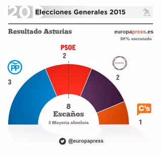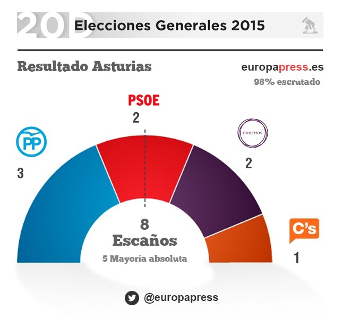 En Asturias, con el 100 por ciento de votos escrutados, la coalición PP-Foro consigue 3 diputados, mientras que el PSOE y Podemos obtienen 2 escaños cada uno.