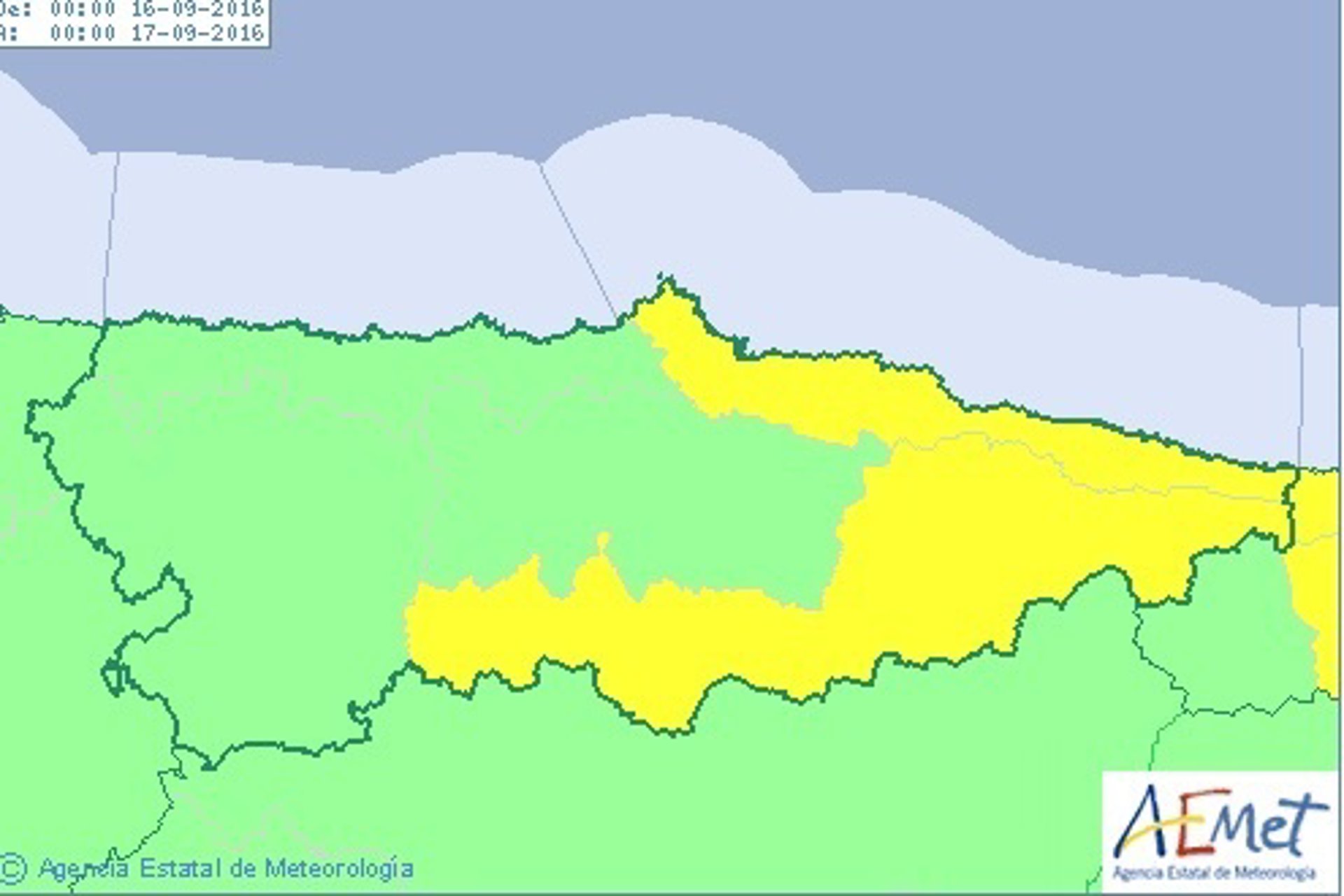 La cordillera Cantábrica, Picos d e Europa y el litoral oriental estarán en alerta amarilla (riesgo) por lluvias este viernes, 17 de septiembre, según el pronóstico de la Agencia Estatal de Meteorología (AEMET).