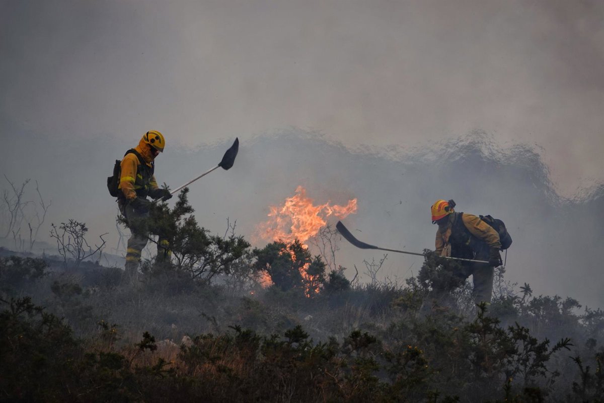 Bomberos de Asturias trabajan para extinguir las llamas en un incendio forestal, a 28 de marzo de 2023, en Toraño, Parres, Asturias (España). El Gobierno regional activó el pasado jueves por la noche el Plan de Incendios Forestales del Principado de Astu - Xuan Cueto - Europa Press