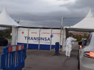 Archivo - Carpa de Transinsa en la que se ha instalado un Autocovid en Gijón, con coches esperando a la realización de las PCR. - EUROPA PRESS - Archivo